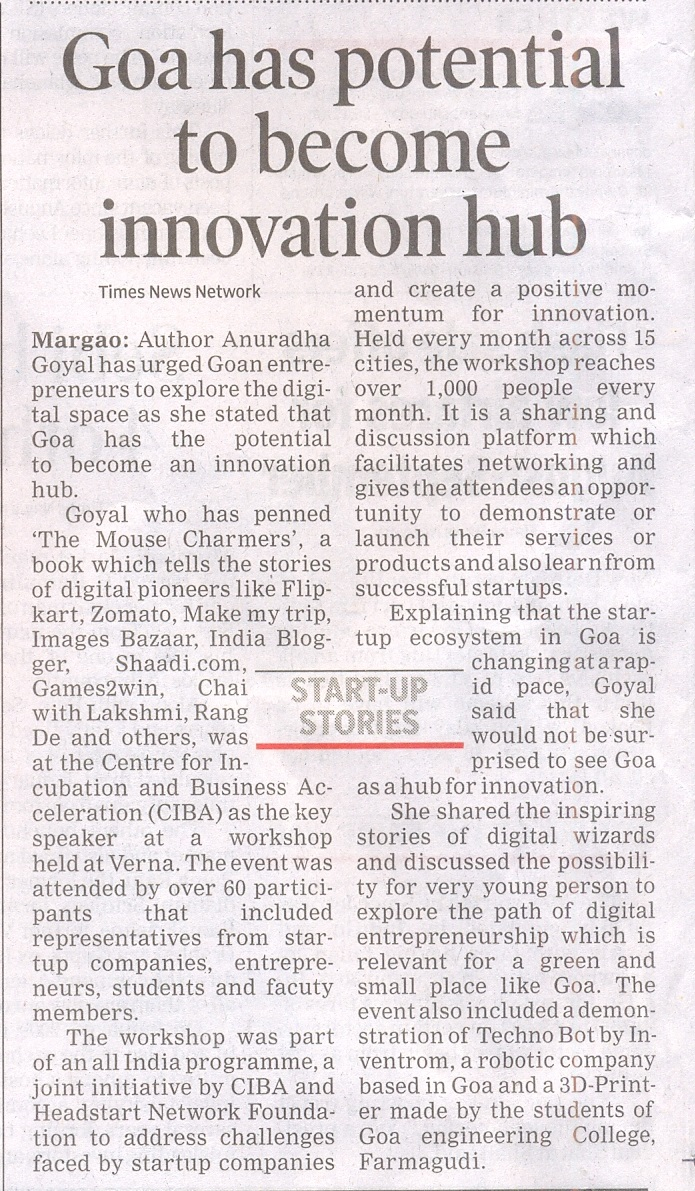 Author Anuradha Goyal, who has penned “The Mouse Charmers”, a book which tells the stories of digital pioneers like Flipkart, Zomato, Make my trip, Images Bazaar, India Blogger, Shaadi.com, Games2win, Chai with Lakshmi, Rang De and others, was at the Centre for Incubation and Business Acceleration (CIBA) as the key speaker at Headstart Startup Saturday in Asscociation with CIBA in Goa. Goyal urged the GOAN Entrepreneurs to explore the digital space and stated that GOA has the potential to become an Innovation Hub!